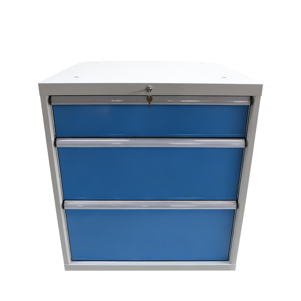 Třízásuvkový kontejner pracovního stolu, šířka 717, výška 800, hloubka 727 mm, 1x zásuvka 150, 1x 250, 1x 300 mm. Barva korpusu RAL 7035 světle šedá, barva zásuvek RAL 5012 modrá.