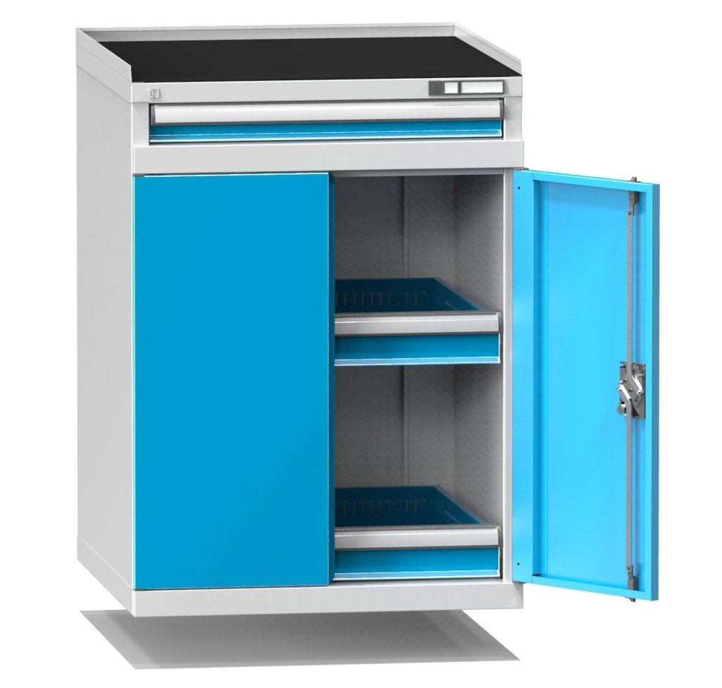 Strojní skříň, zásuvky šířka 612 x hloubka 612 mm (36 x 36D), zvýšená hrana 20 mm, gumová podložka, 3x zásuvka – 1x 75 E vnější, 2x zásuvka 100E uvnitř za dvířky, dvířka, nosnost 700 kg.