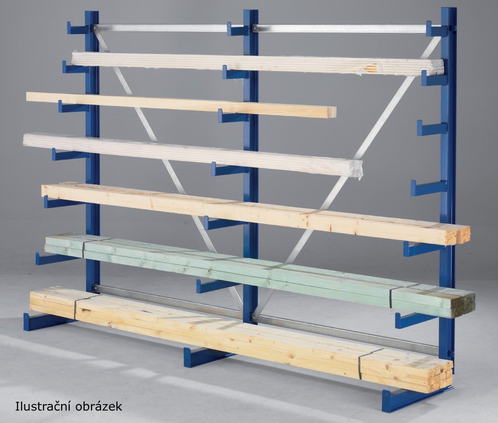 Konzolový regál ATLAS ST oboustranný s rozdílnou délkou ramen. Počet ramen 2 x 6 na jednu stojinu, počet stojin 4. Výška regálu 2000 mm, šířka 4050 mm, hloubka 1090 mm, barva modrá RAL 5010. Nosnost ramene 200 kg.