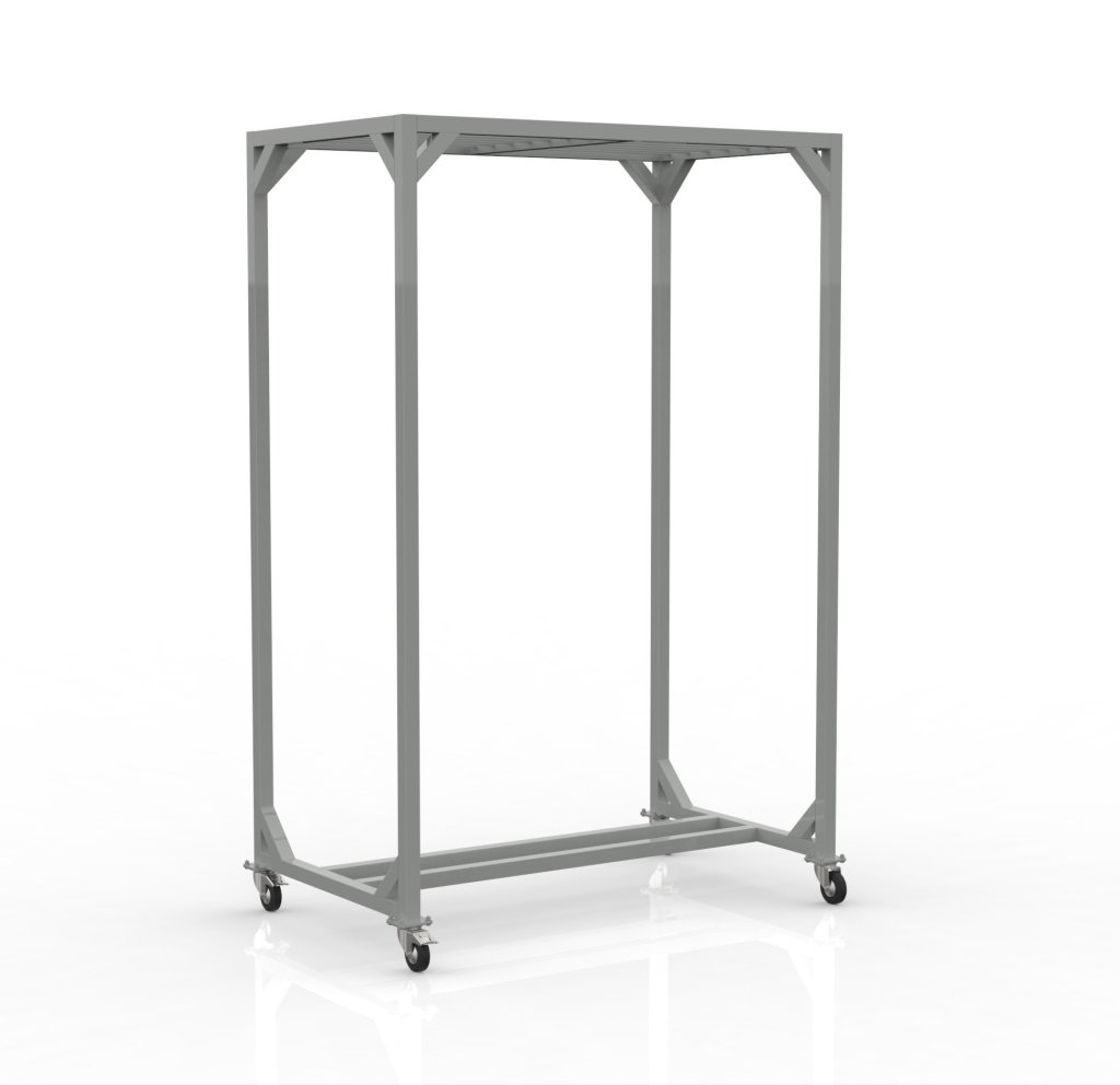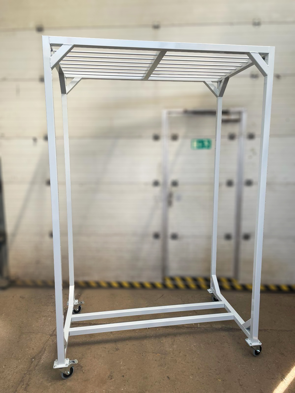 Svařovaná konstrukce pro zavěšení. Tato robustní konstrukce je ideálním řešením pro průmyslové provozy, kde je potřeba zajistit bezpečný převoz dílů např. po tepelném zpracování. Konstrukce ze svařovaného jeklu o rozměrech 45 x 45 mm je opatřena šedým lakem. Součástí jsou 2 kolečka s brzdou a 2 kolečka bez brzdy o průměru 100 mm. Nosnost je 500 kg. Rozměry 2300 x 1500 x 900 mm.