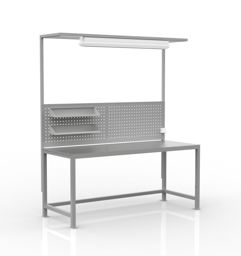 Svařovaný dílenský stůl s nástavbou. Součástí stolu je pracovní plocha z ocelového plátu tloušťky 10 mm, perfopanel pro zavěšení celý popis a parametry