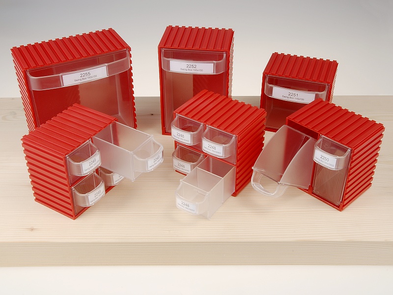 Swing Boxy jsou výklopné krabičky vytvořené pro uložení malých součástek a různého drobného materiálu. Výrobky jsou koncipovány jako stavebnice.