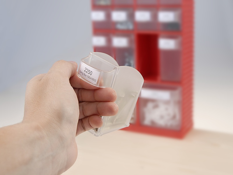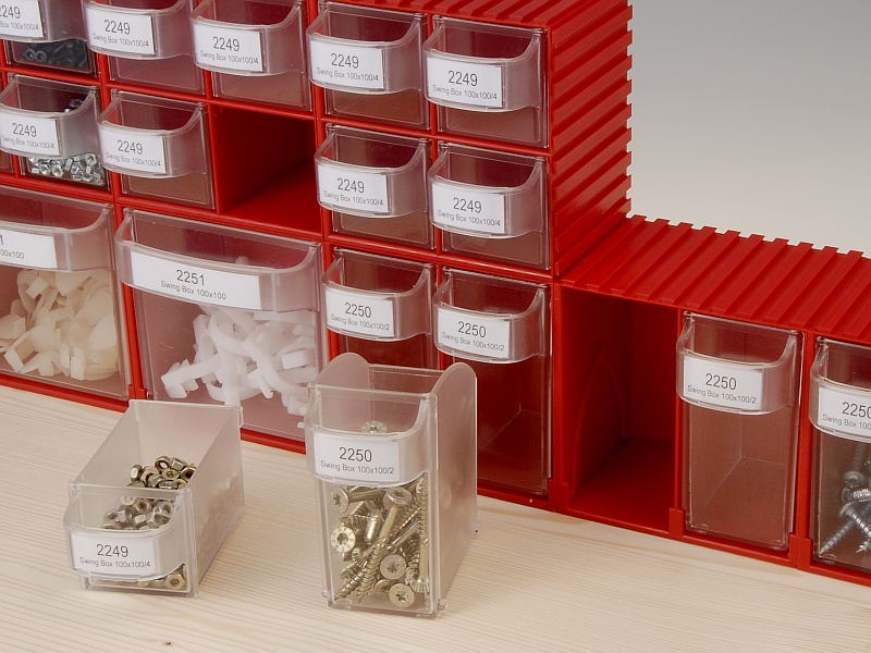Každý swing box má průhledný kontejner. U něketrých typů swing boxů je vyklápěcí, u jiných vysouvací. Pro všechny však platí, že kontejner s obsahem je možné vyjmout a volně s ním manipulovat dle potřeby. Průhlednost umožňuje snadnou a rychlou identifikaci uložených součástí.