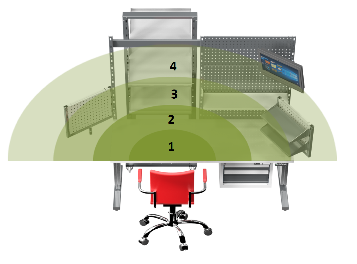 Při sestavování pracoviště a rozmístění nářadí je nejprve potřeba mít na paměti rozmístění pracovních zón. Pracoviště lze rozdělit na 4 zóny, jejichž vzdálenost od operátora se může měnit v závislosti na fyzických dispozicích pracovníka. Zóna 1 má poskytovat dostatečně prostornou pracovní plochu v bezprostředním dosahu. Zatímco zóna 2 by se měla nacházet v komfortním dosahu pro obě ruce, zóna 3 by měla by měla umožňovat snadný dosah alespoň jednou rukou. V zóně 3 mohou být umístěny například nejčastěji používané nástroje, které lze pomocí držáků na nářadí přichytit na postranní perforovaný panel. Do této zóny je také vhodné umístit plastové boxy se součástkami používanými pro montáž. Zóna 4 je potom zónou nejvzdálenější a má sloužit zejména jako ukládací prostor. Sem patří například perforovaný panel s držáky nástrojů pro přehledné a na první pohled viditelné uložení nářadí.
