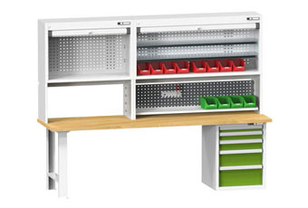Pro maximálně přehledné uložení nástrojů a materiálu slouží perforované panely, které lze snadno doplnit o závěsný program obsahující držáky nástrojů a krabiček, háčky různých velikostí nebo magnetické lišty. Pokud raději nářadí a materiál ukládáte do uzavíratelného a uzamykatelného prostoru, pak je ideálním řešením skříňová nástavba s roletou. Základem skříňové nástavby jsou podstavce v šířce 1000 nebo 1500 mm, na které lze umístit roletové skříně. Podstavce je možné vybavit perforovaným panelem včetně příslušenství, jakým je například police, závěsný systém či osvětlení. Roletová skříň je taktéž vybavena perforovanou zadní stěnou.