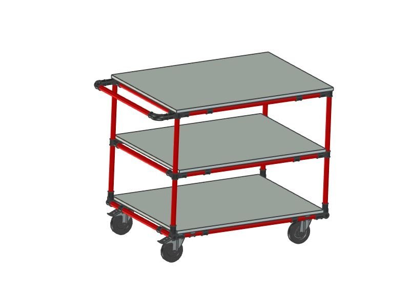 Transportní vozík z trubkového stavebnicového systému je šikovným pomocníkem vhodným do průmyslových prostor, skladů a výrobních hal. Díky své robustní konstrukci a vysoké nosnosti je ideálním řešením pro přepravu široké škály zboží a materiálů. Lamino deska tloušťky 18 mm poskytuje pevný a stabilní odkládací plochu. Nosnost vozíku 300 kg, nosnost patra 100 kg. Vozík je vybaven kolečky o průměru 120 mm, které umožňují snadný a plynulý pohyb.