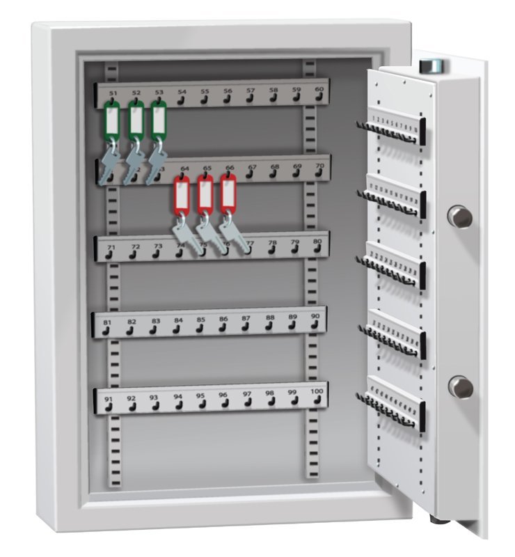 Trezor na klíče Key-Safe 13001. Pro 100 klíčů. Rozměry - V 636 x Š 460 x H 120 mm. Hmotnost 30 kg. Pro bezpečnou úschovu klíčů v kancelářích, skladech, hotelových zařízeních atd. Na výběr dalších 9 modelů.
