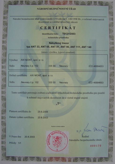Nábytkový trezor ANT 111 je certifikován dle ČSN 1143-1 akreditovaným certifikačním orgánem TREZOR TEST s.r.o. a je zařazen do celý popis a parametry