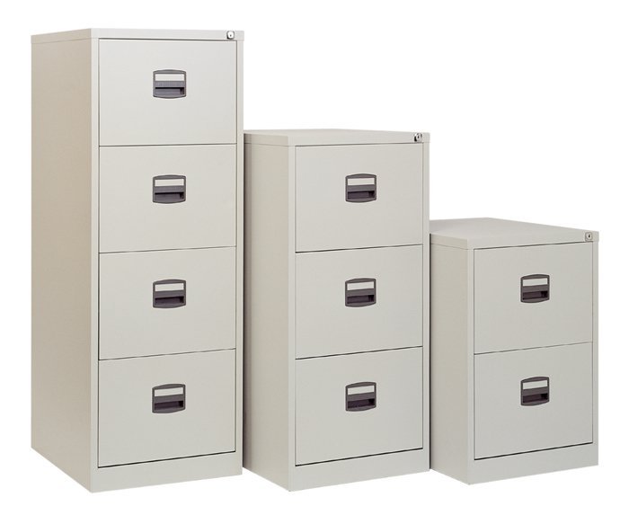 Třízásuvkové kovové kartotéky pro dokumenty nebo závěsné kapsy formátu A4 a Foolscap, šířka 413 nebo 470, výška 1016, hloubka 622