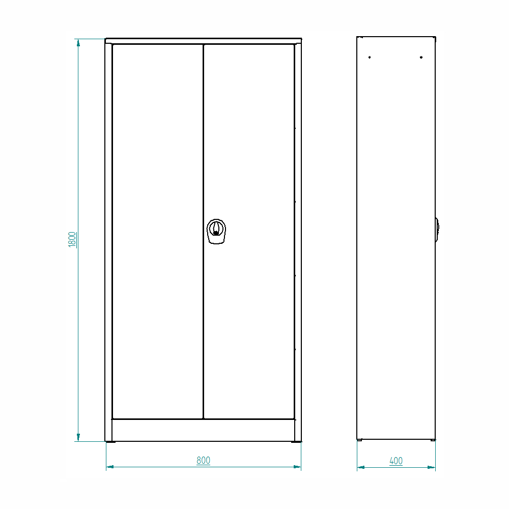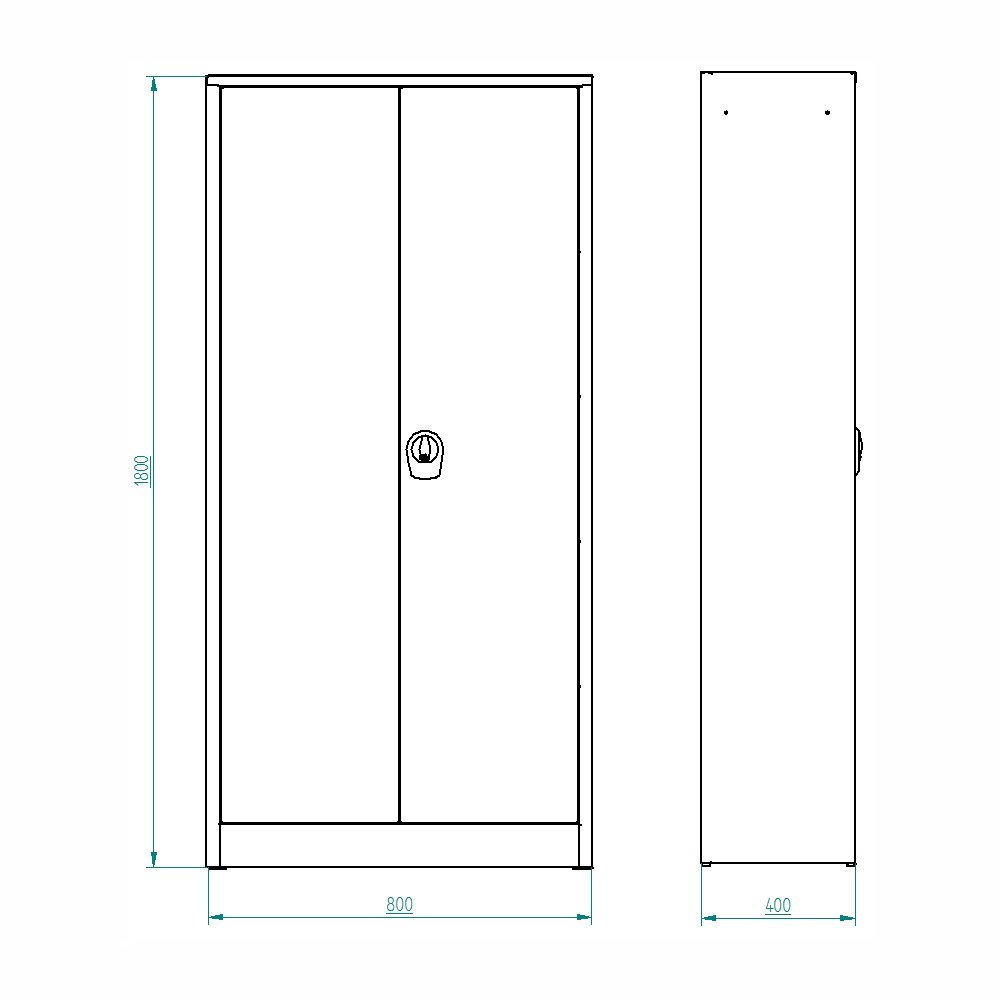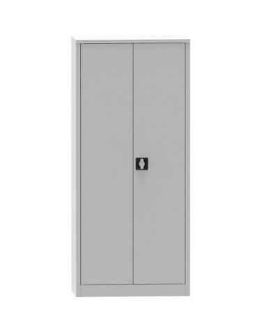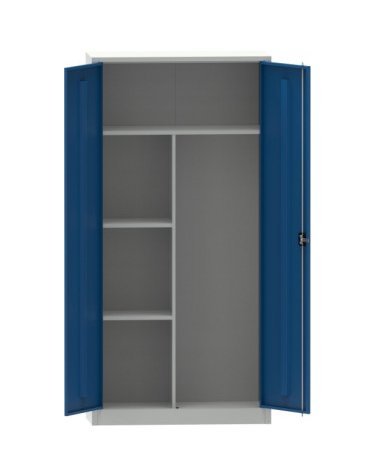 Dvoudveřová kovová skříň se čtyřmi policemi a šatním oddílem s výsuvnou tyčí pro zavěšení ramínek, šířky 1000 mm (viz varianty produktu), výška 1990, hloubka 435 mm. Dvoubodový rozvorový zámek, různé barvy.
