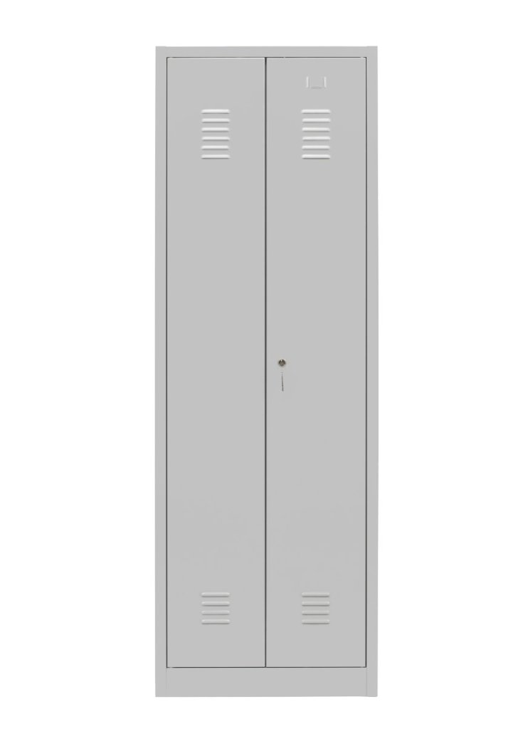 Dvoudveřová skříň se soklem dělená, šířka 800, výška 1950, hloubka 400 mm, 4 police. Možnost náhrady plných dveří dveřmi se skleněnou výplní, s drátěnou výplní nebo lamino dveřmi v odstínu buk, bříza nebo třešeň. Barva korpusu RAL 7035 světle šedá.