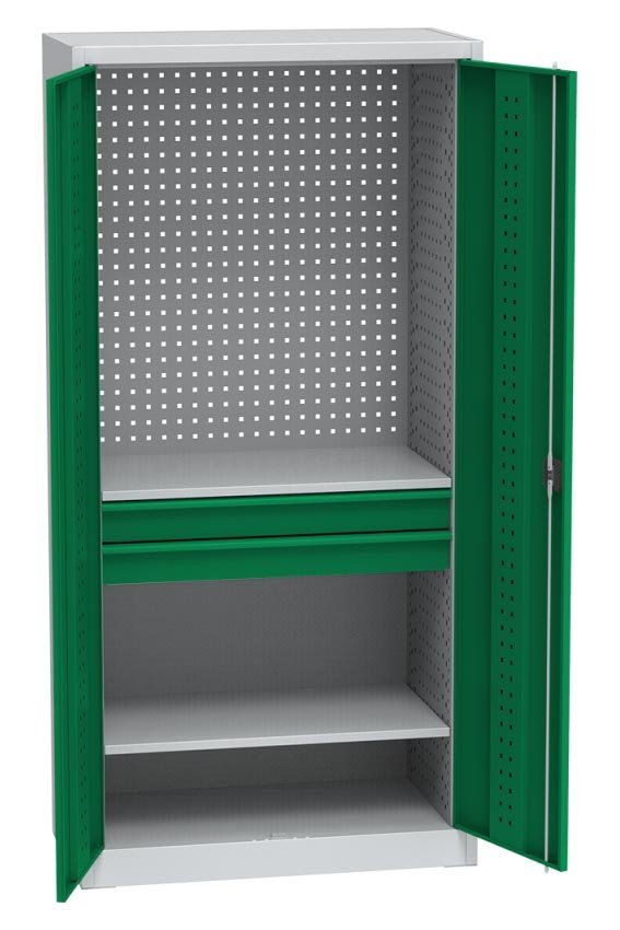 Dvoudveřová kovová skříň s 2 policemi, 2 zásuvkami a vnitřní DVB perforací pro instalaci zásuvek DUS_11_Z10. Rozměry výška 1950 x šířka 950 x hloubka 500 mm. Zamykání na cylindrický rozvorový zámek. Barva korpusu světle šedá.