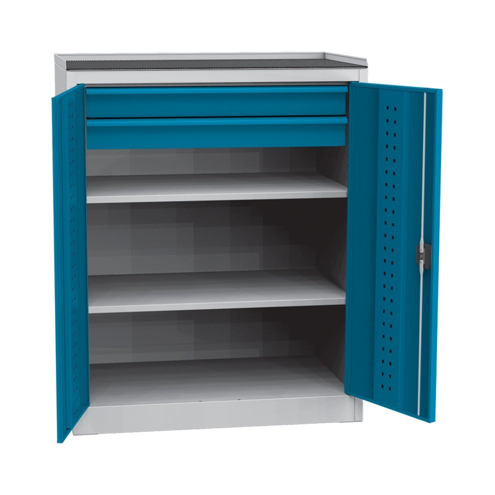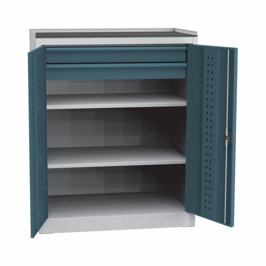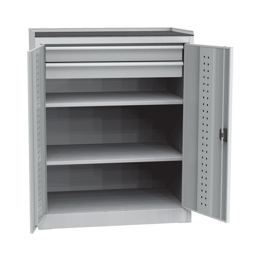 Dvoudveřová kovová skříň s 2 policemi, 1 zásuvkou a vnitřní DVB perforací pro instalaci zásuvek DUS_11_Z10. Rozměry výška 1180 x šířka 950 x hloubka 500 mm. Zamykání na cylindrický rozvorový zámek. Barva korpusu světle šedá.