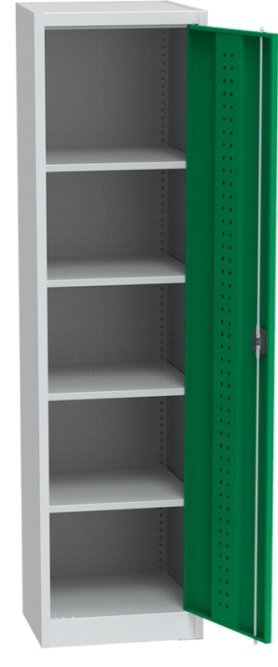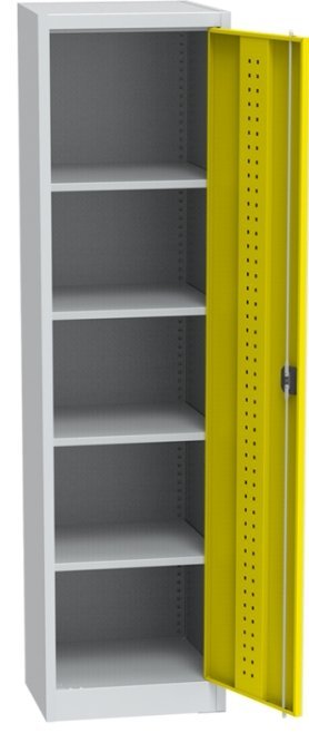 Jednodveřová kovová skříň se čtyřmi policemi. Rozměry výška 1950 x šířka 505 x hloubka 500 mm. Zamykání na cylindrický rozvorový celý popis a parametry