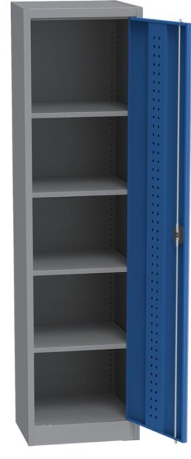 Jednodveřová kovová skříň se čtyřmi policemi. Rozměry výška 1950 x šířka 505 x hloubka 500 mm. Zamykání na cylindrický rozvorový zámek. Barva korpusu světle šedá.