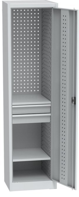 Dvoudveřová kovová skříň s 2 policemi a vnitřní DVB perforací pro instalaci zásuvek DUS_11_Z10. Rozměry výška 1950 x šířka 950 x hloubka 500 mm. Zamykání na cylindrický rozvorový zámek. Barva korpusu světle šedá.