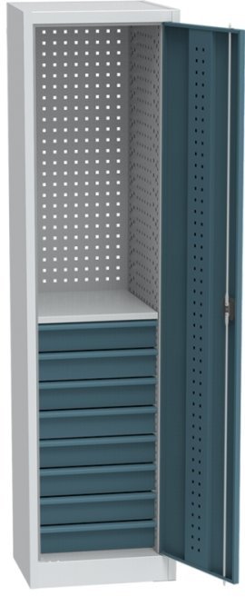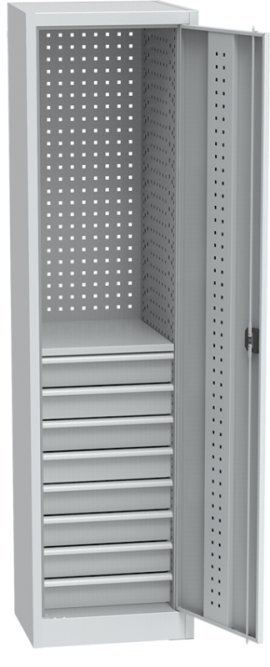 Jednodveřová kovová skříň s 1 policí, 8 zásuvkami a vnitřní DVB perforací pro instalaci zásuvek DUS_13_Z10. Rozměry výška 1950 x šířka 505 x hloubka 500 mm. Zamykání na cylindrický rozvorový zámek. Barva korpusu světle šedá.