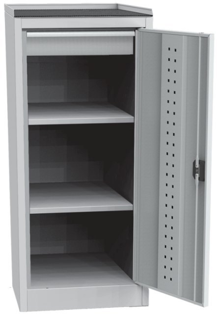Jednodveřová kovová skříň se 2 policemi, 1 zásuvkou a vnitřní DVB perforací pro instalaci zásuvek DUS_13_Z10. Rozměry výška 1180 x šířka 505 x hloubka 500 mm. Zamykání na cylindrický rozvorový zámek. Barva korpusu světle šedá.