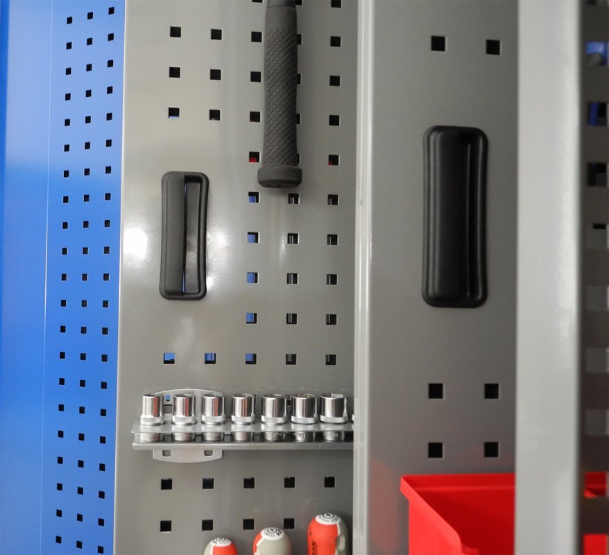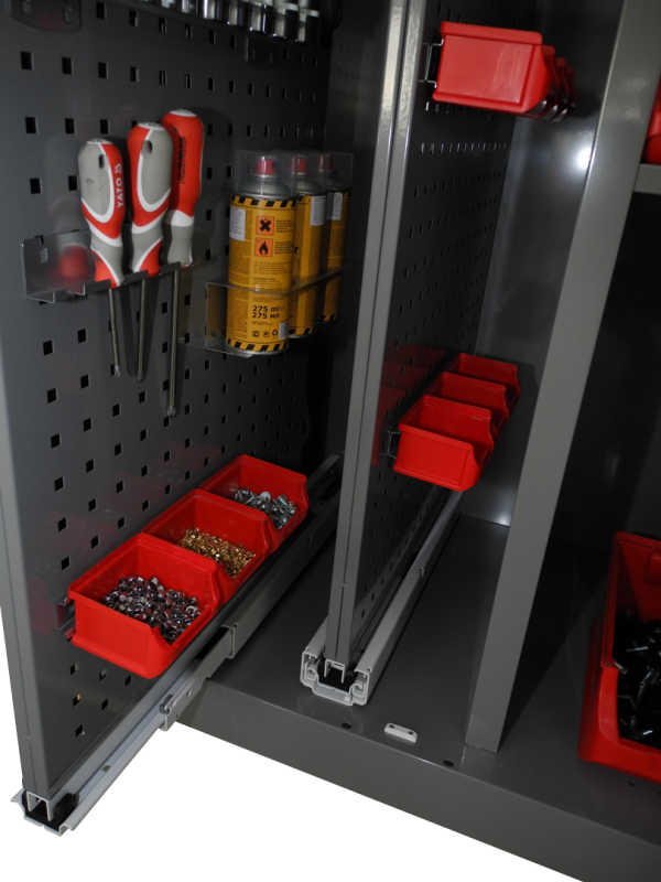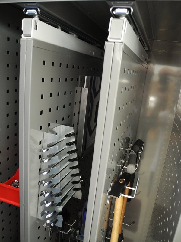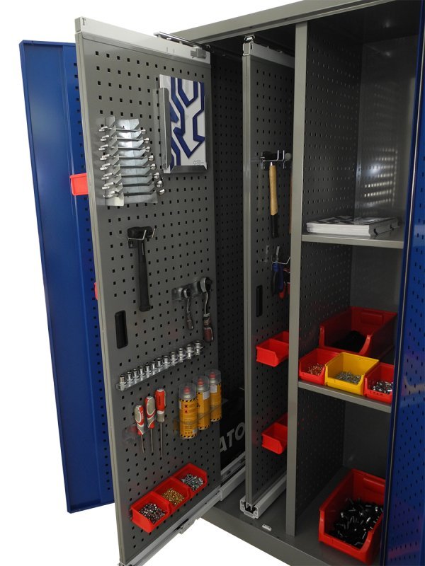 Univerzální dílenská skříň pro přehledné uložení nářadí a nástrojů. Vnitřní uspořádání - 2 x výsuvný oboustranný perfopanel, 5 x celý popis a parametry