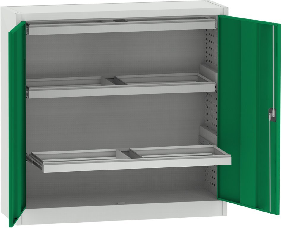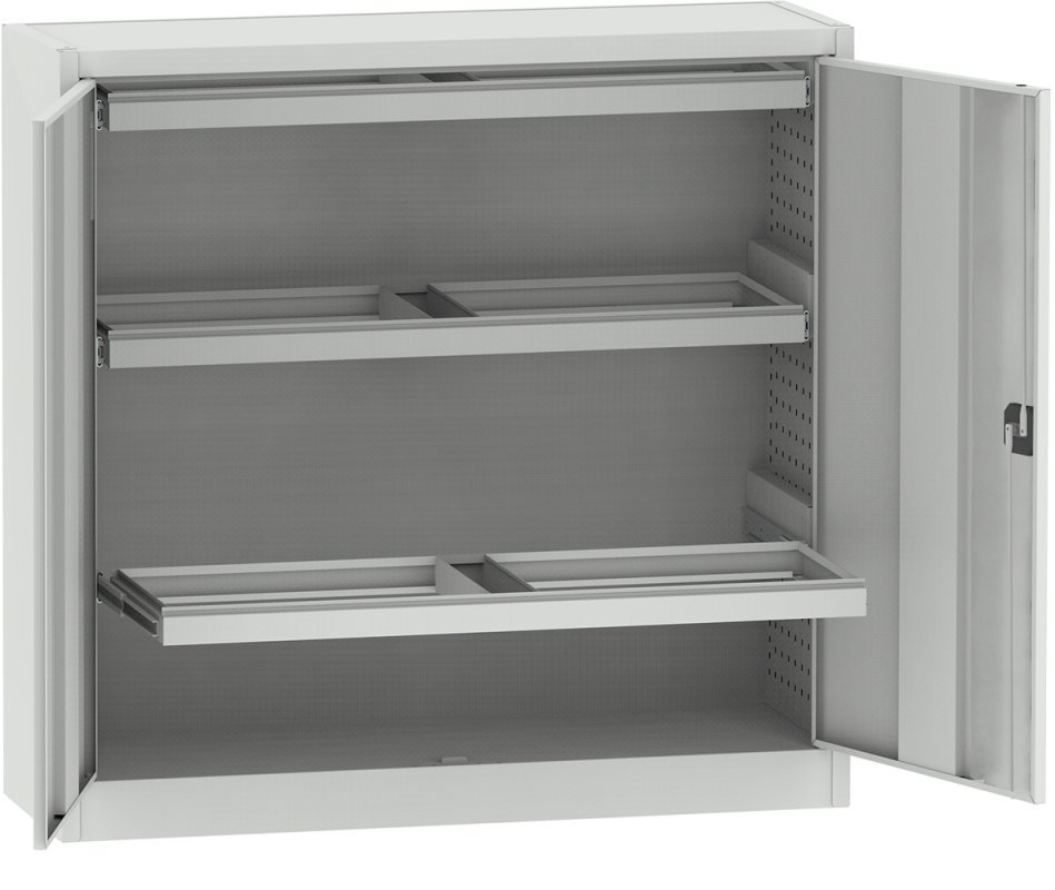 Dvoudveřová kovová skříň s třemi výsuvnými rámy. Rozměry výška 1150 x šířka 1200 x hloubka 400 mm. Zamykání na cylindrický rozvorový zámek. Barva korpusu světle šedá.