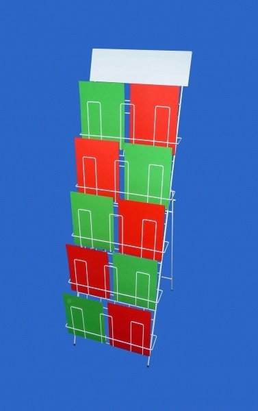 Univerzální stojany na prospekty k volnému postavení. Kovové, barva bílá. Vhodné pro noviny, časopisy, katalogové listy aj. Pro různé formáty (5x A3, 10x A4, 15x A5). Prostor pro samopleku s logem. Celkové rozměry stojanů v mm (V x Š x H) 1470 x 475 x 640.