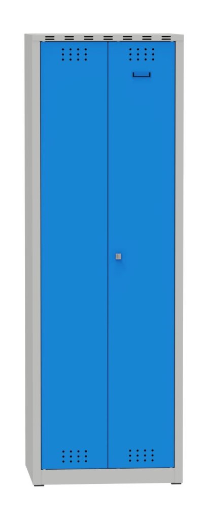 Velkoobjemová šatní skříň se společnými dveřmi, výška 1800 x šířka 600 x hloubka 500 mm. Skříň je vybavena policí, tyčí na ramínka s posuvnými háčky, barva korpusu RAL 7035 světle šedá. Zamykání rozvorovým zámkem.
