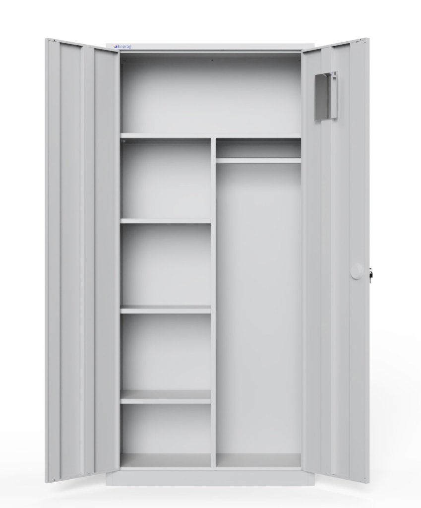 Dvoudveřová demontovaná skříň z ocelového plechu tloušťky 0,6 mm. Výška 1850 x šířka 900 x hloubka 390 mm, 4x police, cylindrický rozvorový zámek se dvěma klíči. Povrchová úprava práškovou barvou - korpus tmavě šedý, dveře bílé.