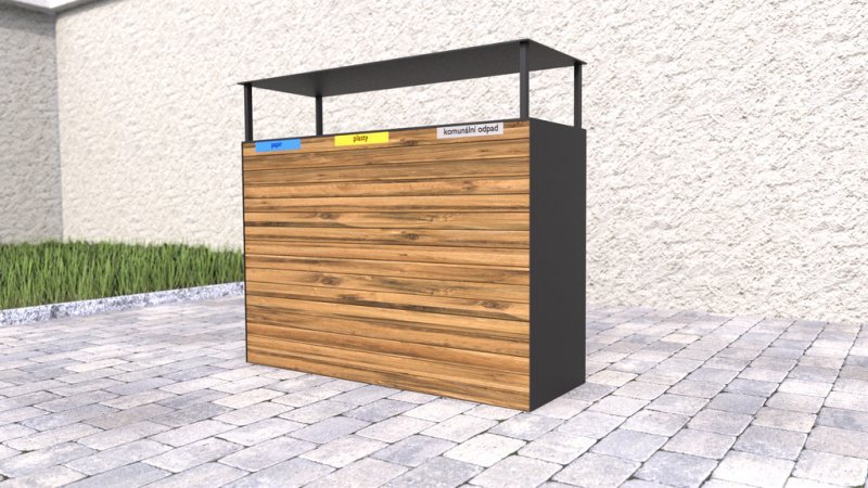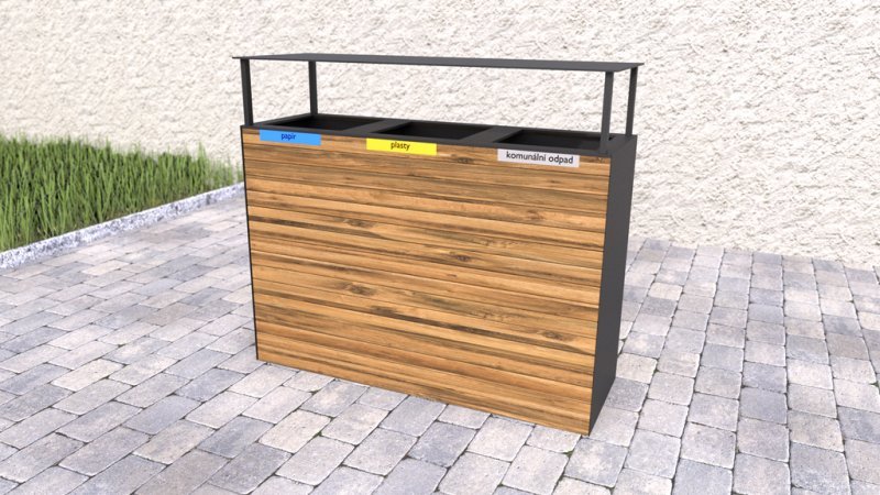 Venkovní odpadkový koš na tříděný odpad s dřevěným pláštěm a stříškou.Dřevěné latě jsou 3x ošetřeny lazurou, která chrání venkovní nábytek před UV zářením a povětrnostními vlivy. Koš má vyjímatelné pozinkované vložky na odpad o objemu 65 l. Hmotnost 80 kg.