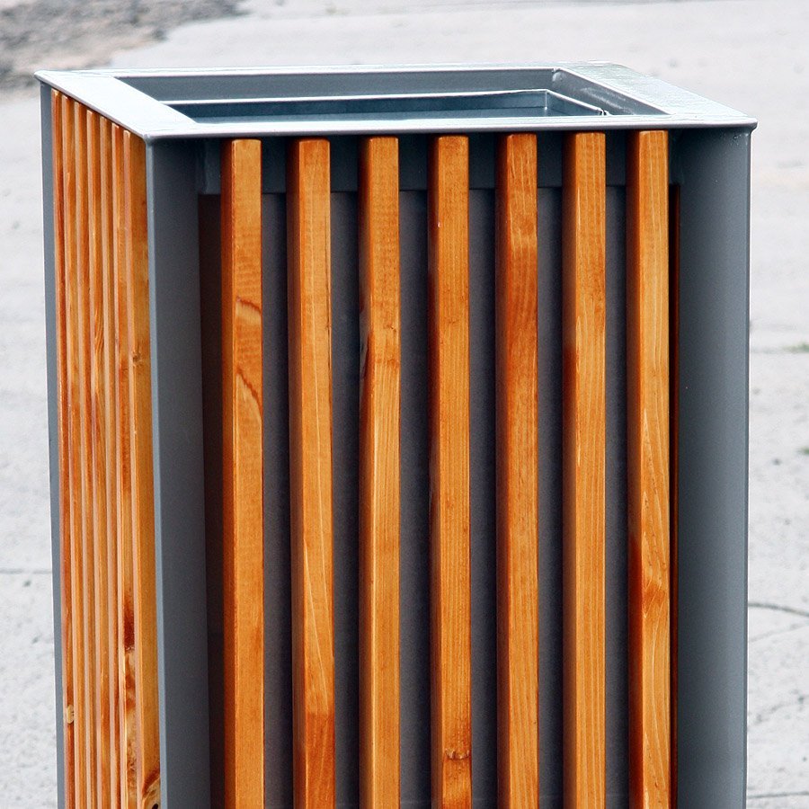 Moderní dřevěný odpadkový koš vhodný na zahradu ale i na městské náměstí. S vyjímatelnou vložkou. Povrchová úprava - mořené dřevo odstín pinie, rám kovový RAL 9007. Objem - 65 l. Záruka 2 roky. Cena je včetně rámu a vložky!