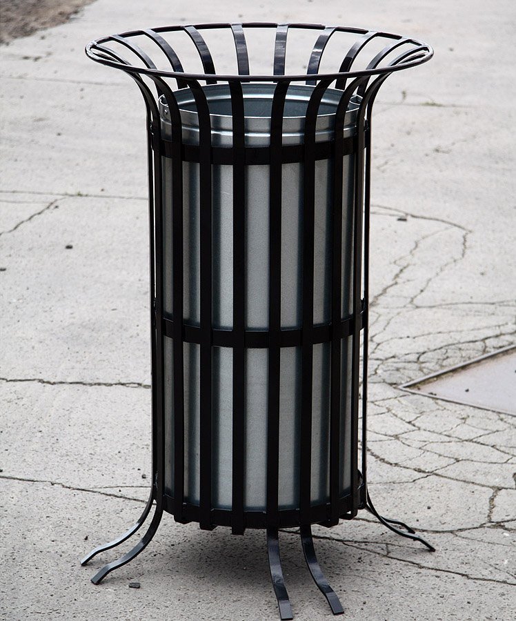 - robustní kovový odpadkový koš se zajímavým vzhledem