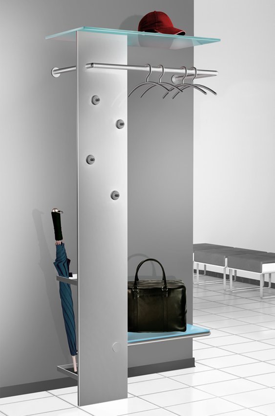 Ocelová věšáková stěna ve stříbrné barvě. Police na klobouky z průhledného bezpečnostního skla, 5 ramínek, 6 háčků v ceně. Výška 1700 mm, šířka 600 mm, hloubka (bez ramínek) 330 mm.