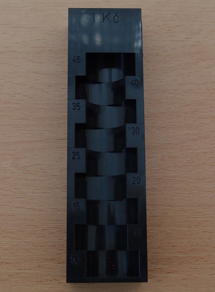 Náhradní segment do přihrádky na mince v hodnotě 1 Kč, na 45 mincí (45 Kč), rozměry 115 x 32 x 19 mm.