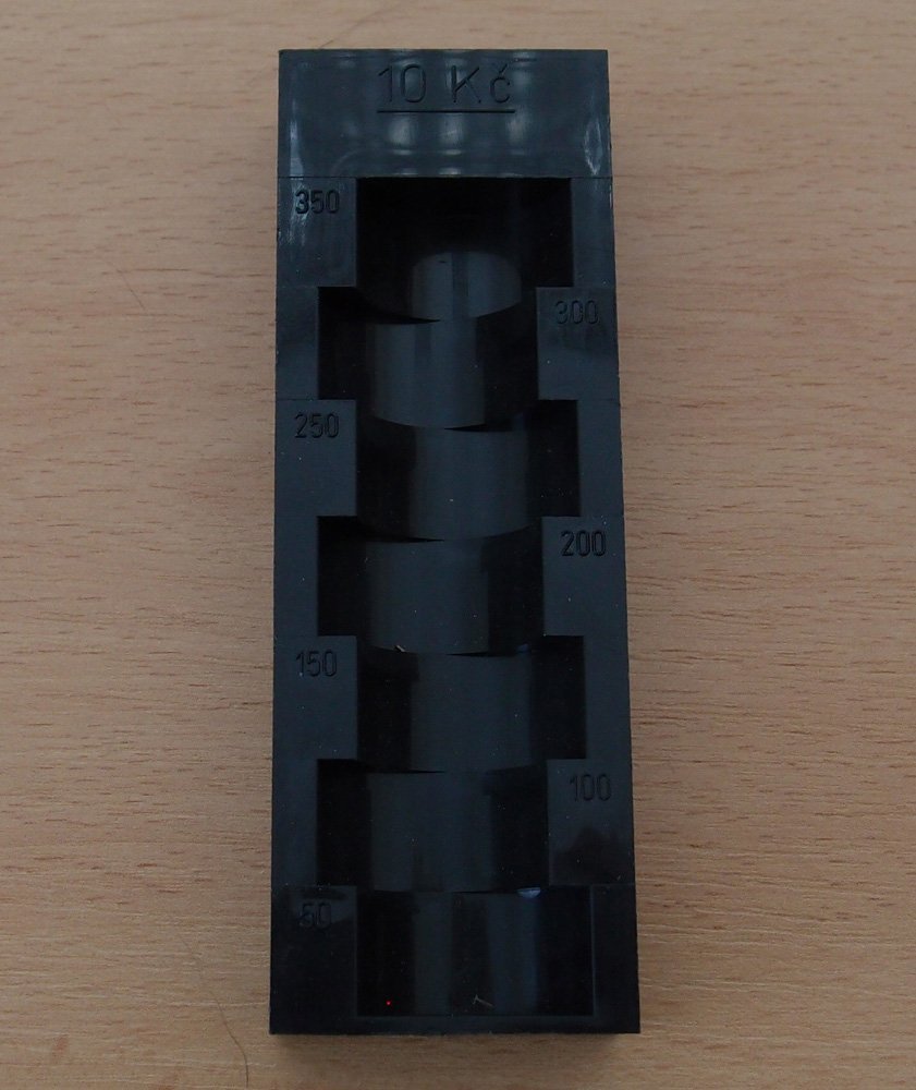 Náhradní segment do přihrádky na mince v hodnotě 10 Kč, na 35 mincí (350 Kč), rozměry 115 x 40 x 19 mm.