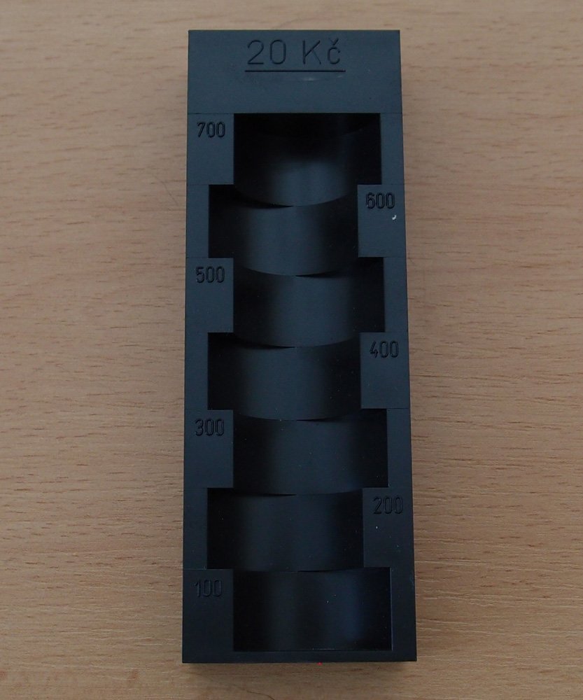 Náhradní segment do přihrádky na mince v hodnotě 20 Kč, na 35 mincí (700 Kč), rozměry 115 x 40 x 19 mm.