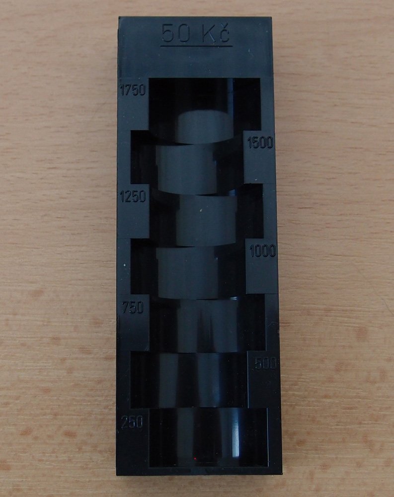 Náhradní segment do přihrádky na mince v hodnotě 50 Kč, na 35 mincí (1750 Kč), rozměry 115 x 40 x 19 mm.