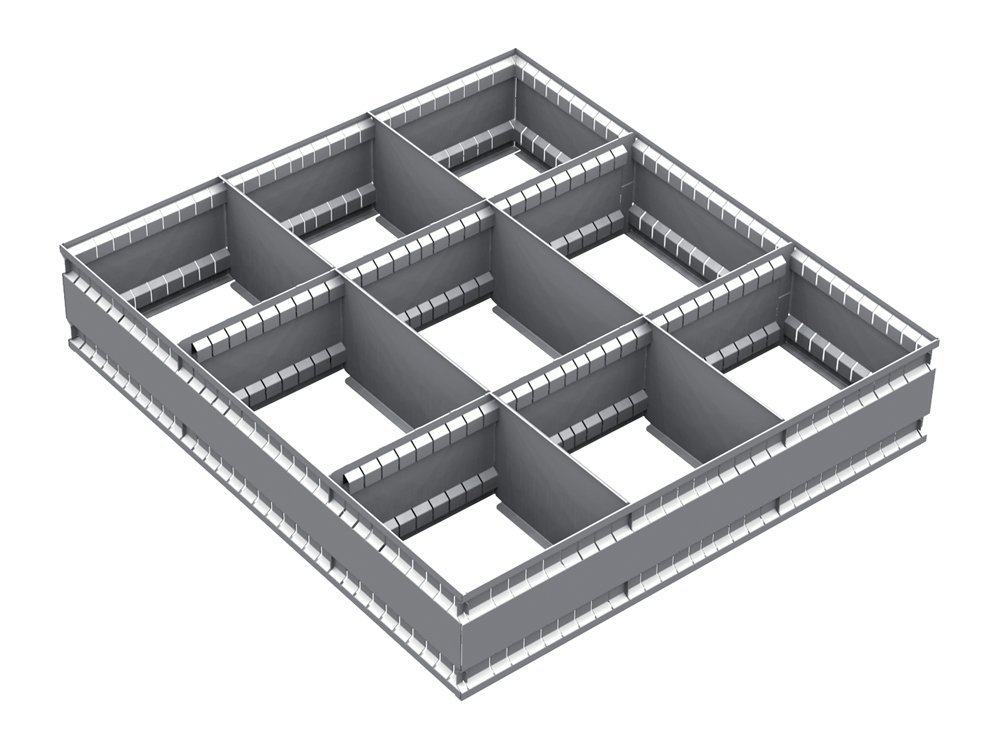 Vnitřní dělení zásuvek VND EPO 12B. Instalace je možná do zásuvek, kde výška čela zásuvky je 120 a 150 mm. Rozměr 95 x 538 x 457 mm.