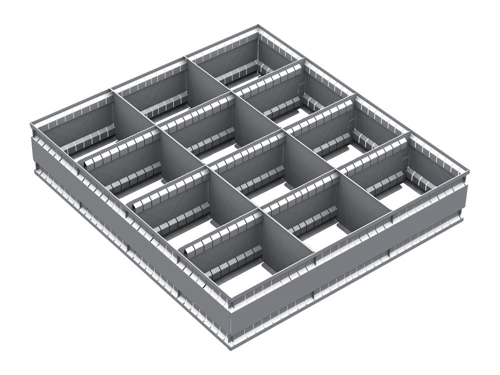 Vnitřní dělení zásuvek VND EPV 12C. Instalace je možná do zásuvek, kde výška čela zásuvky je 120 a 150 mm. Rozměr 95 x 538 x 357 mm.