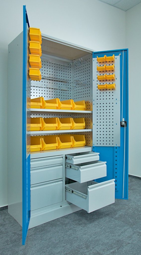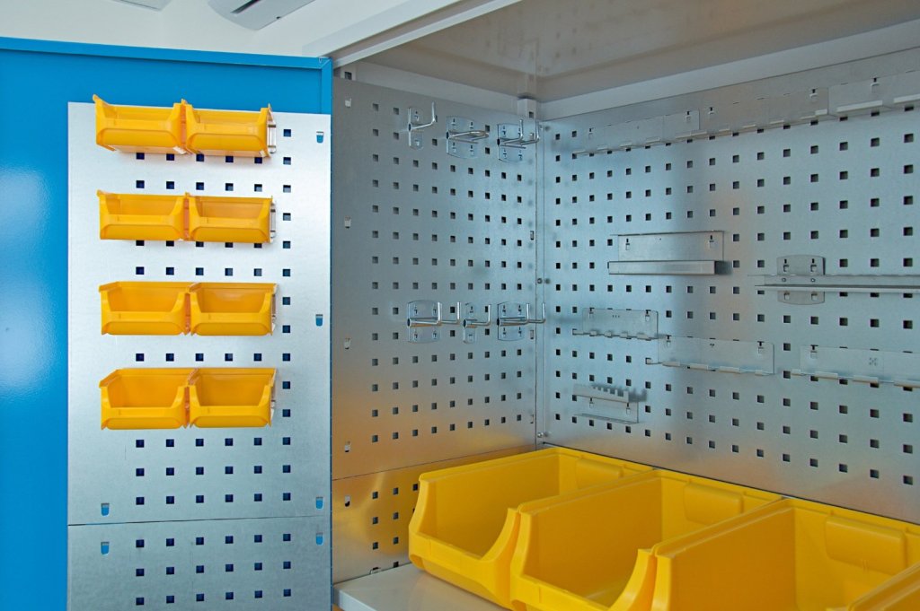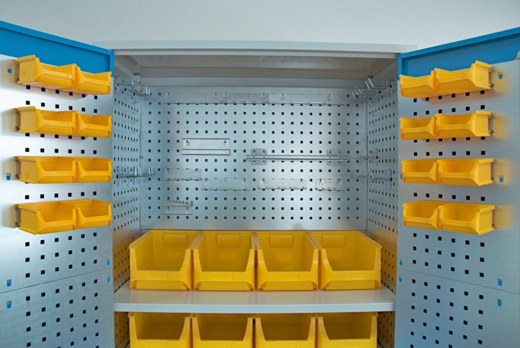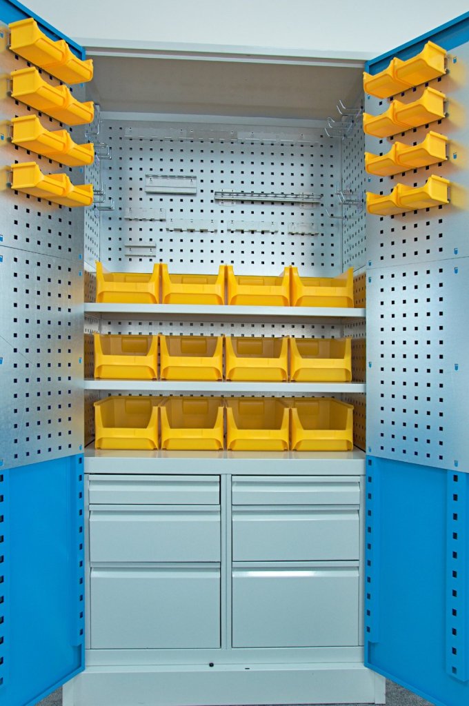 Dvoudveřová dílenská skříň economy s perfopanely. Výška 1950 x šířka 950 x hloubka 500 mm. Tříbodový rozvorový zámek, 4 stavitelné police. Barva korpusu RAL 7035 světle šedá, dveří RAL 7035 světle šedá, RAL 5005 modrá a RAL 5012 modrá. Skladem v provedení světle šedý korpus, modré dveře RAL 5012.