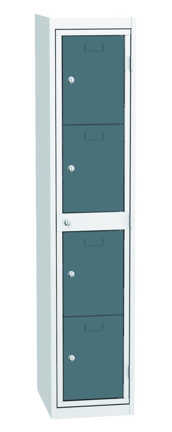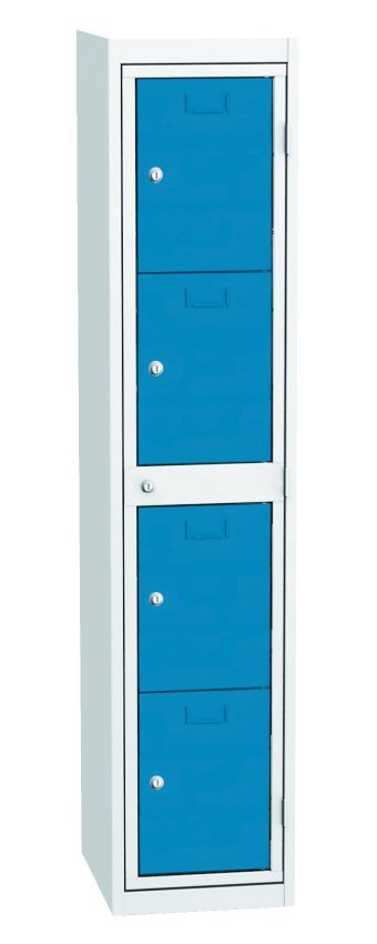 Skříň pro výdej čistých pracovních oděvů, šířka 380, výška 1770, hloubka 460 mm. Obsahuje čtyři výdejní boxy a jeden centrální rám pro obsluhu. Každá výdejní schránka a centrální rám pro obsluhu jsou uzamčeny cylindrickým zámkem. Barva korpusu RAL 7035 světle šedá.