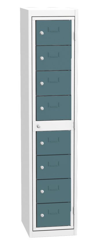 Skříň pro výdej čistých pracovních oděvů, šířka 420, výška 1980, hloubka 500 mm. Obsahuje osm výdejních boxů a jeden centrální rám pro obsluhu. Každá výdejní schránka a centrální rám pro obsluhu jsou uzamčeny cylindrickým zámkem. Barva korpusu RAL 7035 světle šedá.