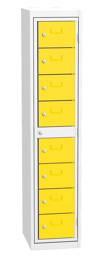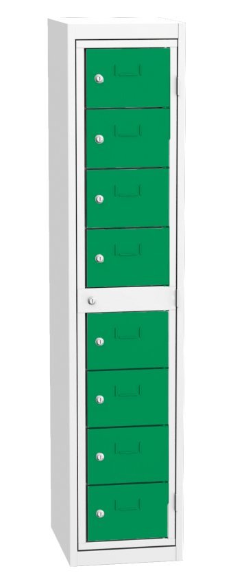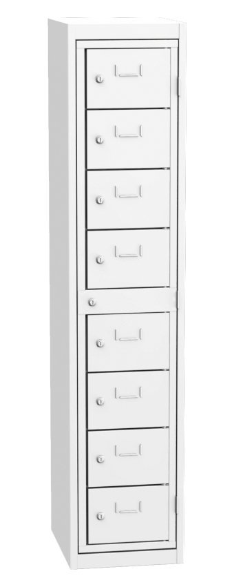 Skříň pro výdej čistých pracovních oděvů, šířka 380, výška 1770, hloubka 460 mm. Obsahuje osm výdejních boxů a jeden centrální rám pro obsluhu. Každá výdejní schránka a centrální rám pro obsluhu jsou uzamčeny cylindrickým zámkem. Barva korpusu RAL 7035 světle šedá.