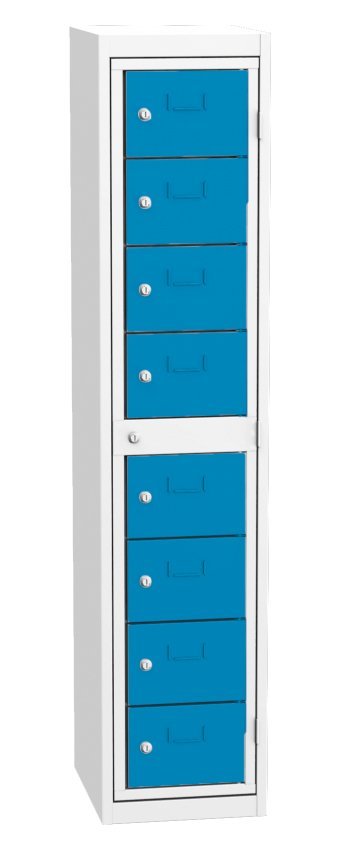 Skříň pro výdej čistých pracovních oděvů, šířka 420, výška 1980, hloubka 500 mm. Obsahuje deset výdejních boxů a jeden centrální rám pro obsluhu. Každá výdejní schránka a centrální rám pro obsluhu jsou uzamčeny cylindrickým zámkem. Barva korpusu RAL 7035 světle šedá.