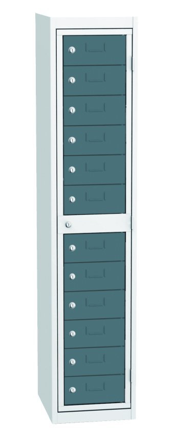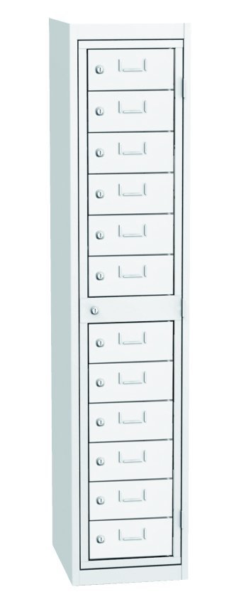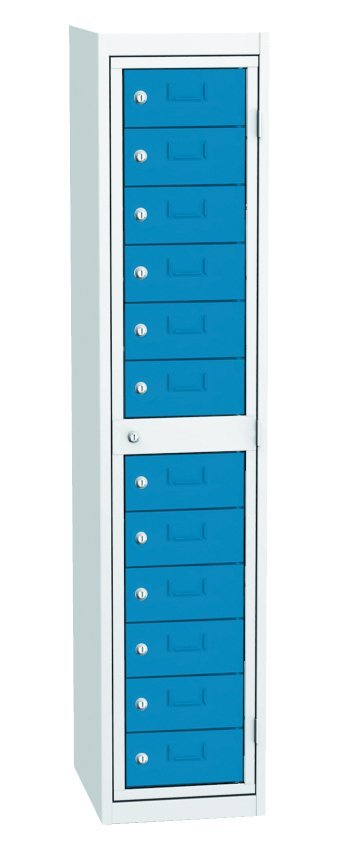 Skříň pro výdej čistých pracovních oděvů, šířka 380, výška 1770, hloubka 460 mm. Obsahuje dvanáct výdejních boxů a jeden centrální rám pro obsluhu. Každá výdejní schránka a centrální rám pro obsluhu jsou uzamčeny cylindrickým zámkem. Barva korpusu RAL 7035 světle šedá.