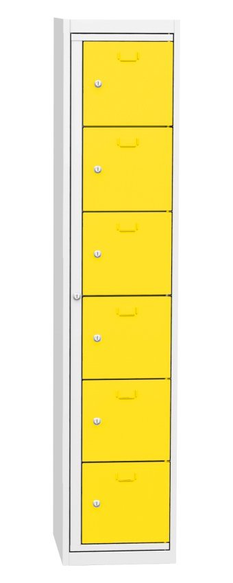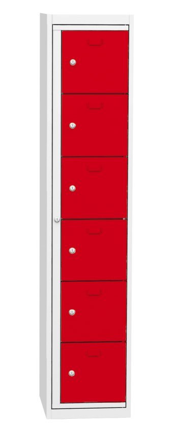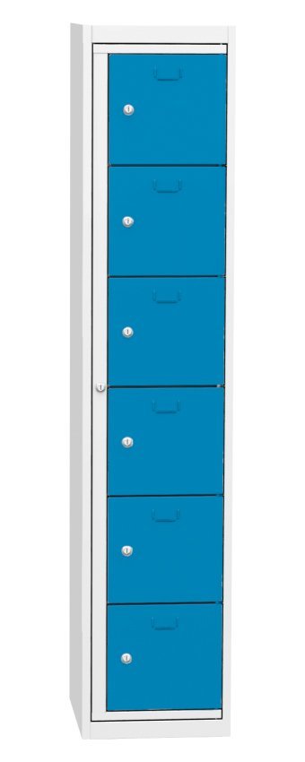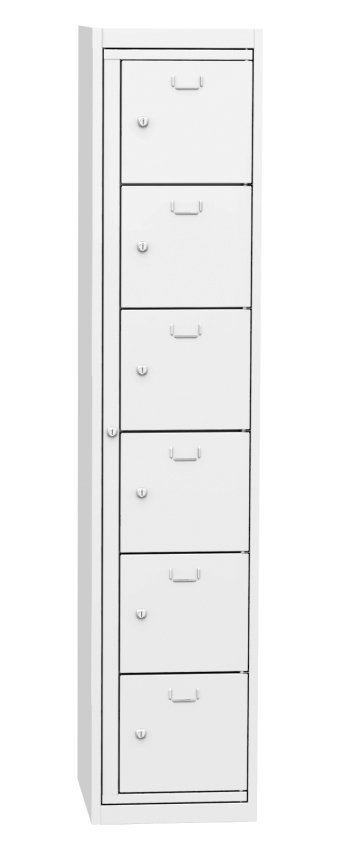 Skříň pro výdej čistých pracovních oděvů, šířka 380, výška 1770, hloubka 460 mm. Obsahuje šest výdejních boxů a jeden centrální rám pro obsluhu. Každá výdejní schránka a centrální rám pro obsluhu jsou uzamčeny cylindrickým zámkem. Barva korpusu RAL 7035 světle šedá.