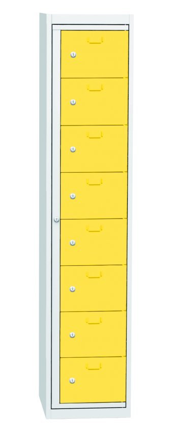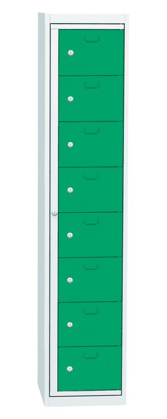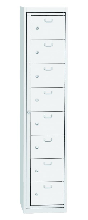Skříň pro výdej čistých pracovních oděvů, šířka 380, výška 1770, hloubka 460 mm. Obsahuje osm výdejních boxů a jeden centrální rám pro obsluhu. Každá výdejní schránka a centrální rám pro obsluhu jsou uzamčeny cylindrickým zámkem. Barva korpusu RAL 7035 světle šedá.
