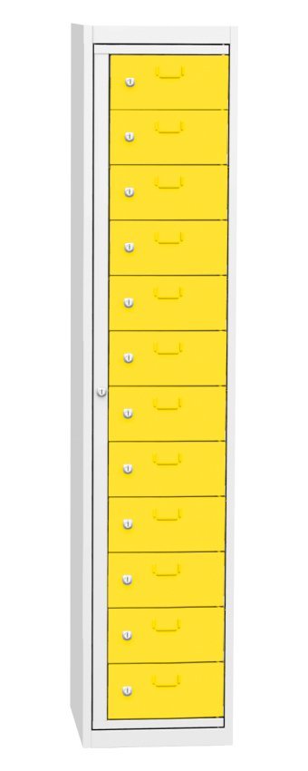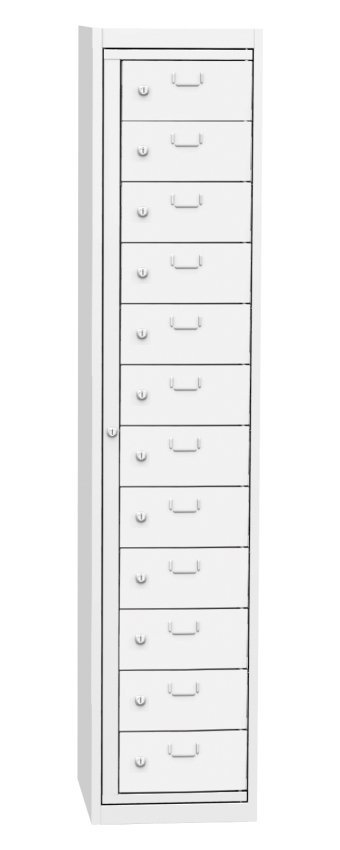 Skříň pro výdej čistých pracovních oděvů, šířka 380, výška 1770, hloubka 460 mm. Obsahuje dvanáct výdejních boxů a jeden centrální rám pro obsluhu. Každá výdejní schránka a centrální rám pro obsluhu jsou uzamčeny cylindrickým zámkem. Barva korpusu RAL 7035 světle šedá.