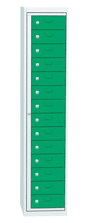 Skříň pro výdej čistých pracovních oděvů, šířka 380, výška 1770, hloubka 460 mm. Obsahuje dvanáct výdejních boxů a jeden centrální rám pro obsluhu. Každá výdejní schránka a centrální rám pro obsluhu jsou uzamčeny cylindrickým zámkem. Barva korpusu RAL 7035 světle šedá.