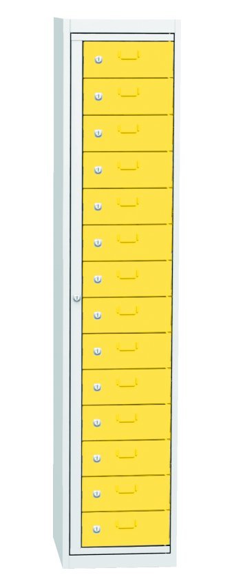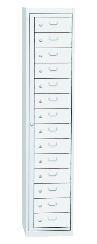 Skříň pro výdej čistých pracovních oděvů, šířka 380, výška 1770, hloubka 460 mm. Obsahuje čtrnáct výdejních boxů a jeden centrální rám pro obsluhu. Každá výdejní schránka a centrální rám pro obsluhu jsou uzamčeny cylindrickým zámkem. Barva korpusu RAL 7035 světle šedá.
