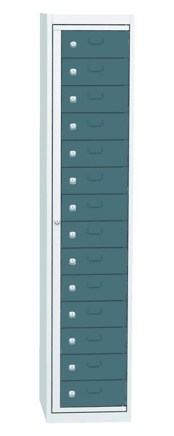 Skříň pro výdej čistých pracovních oděvů, šířka 420, výška 1980, hloubka 500 mm. Obsahuje dvanáct výdejních boxů a jeden centrální rám pro obsluhu. Každá výdejní schránka a centrální rám pro obsluhu jsou uzamčeny cylindrickým zámkem. Barva korpusu RAL 7035 světle šedá.