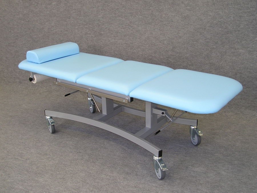 Vyšetřovací lehátko pojízdné. Podhlavník je plynule výškově nastavitelný pomocí zdvíhacího mechanizmu. Kovové části stolu jsou povrchově upravené práškovou technologií. Lůžková čast je omyvatelná koženka. Možnost dodat s držákem na papír. Polohování podhlavníku.